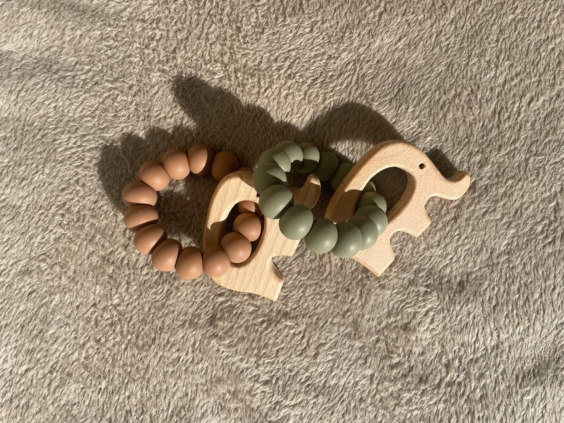 Voici de jolis anneaux de dentitions, avec un petit éléphant et des billes en silicone.