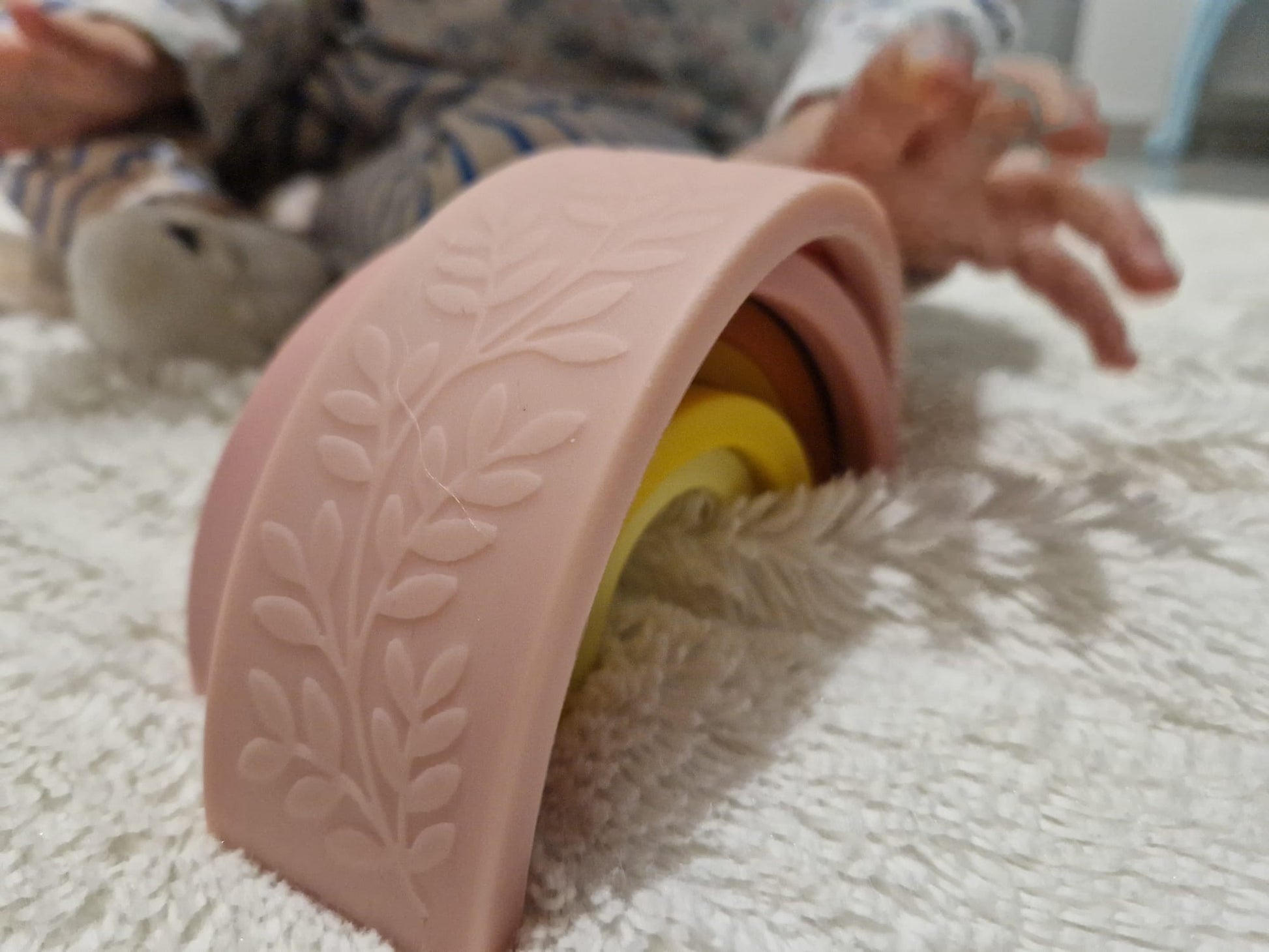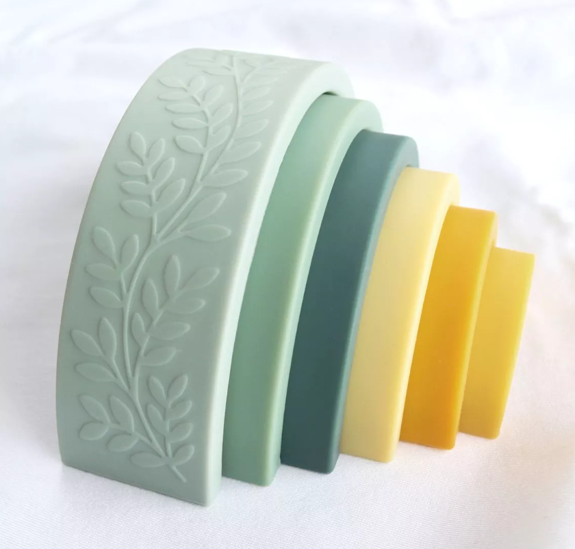 Jeu a empiler en silicone. avec de jolies détails leger de fleurs sur la surface. Il peut etre utilisé a tout âge. Idéale pour développer la motricité.