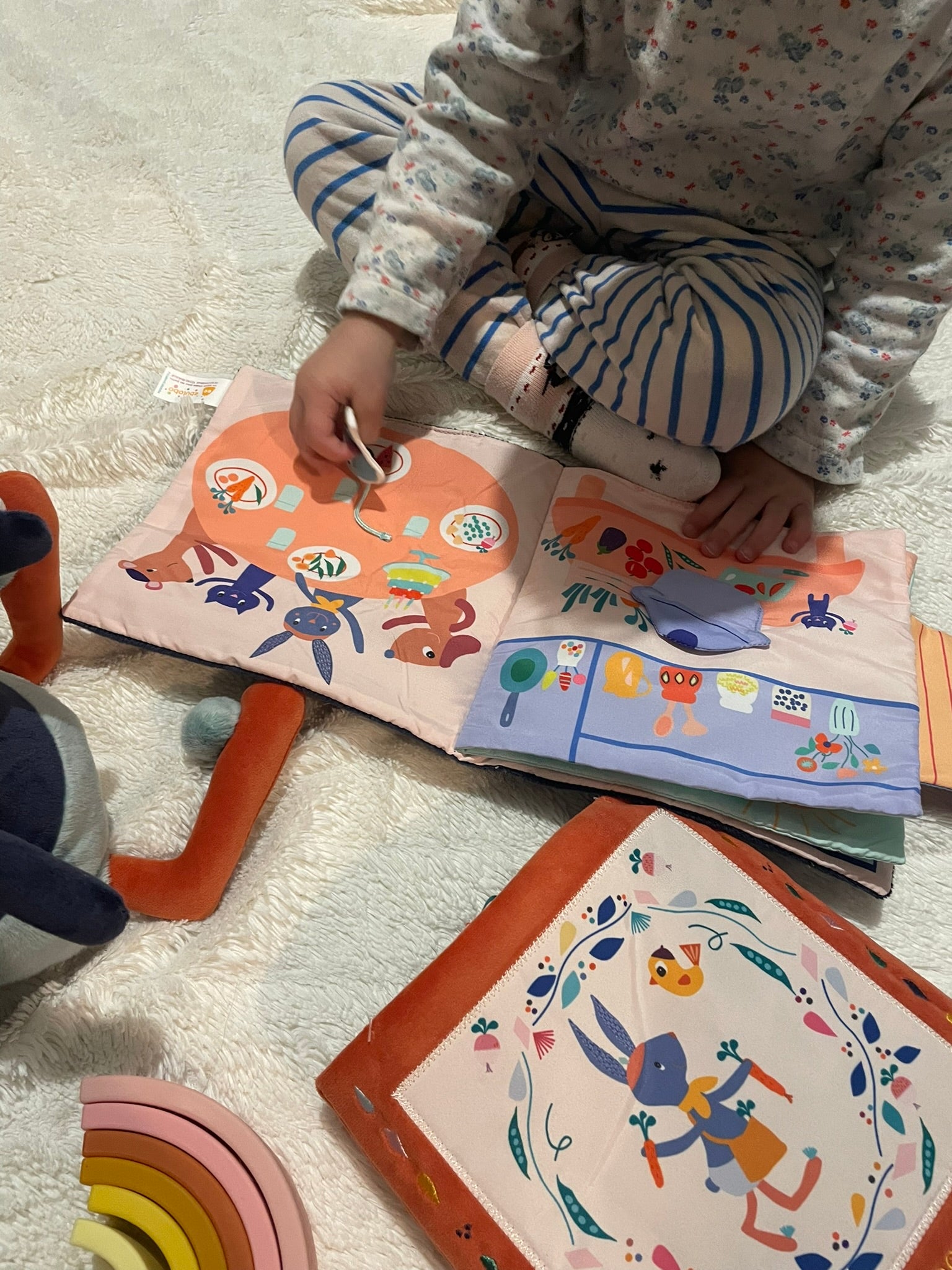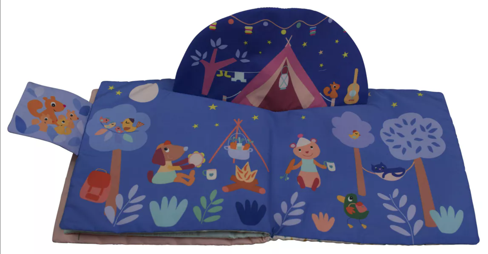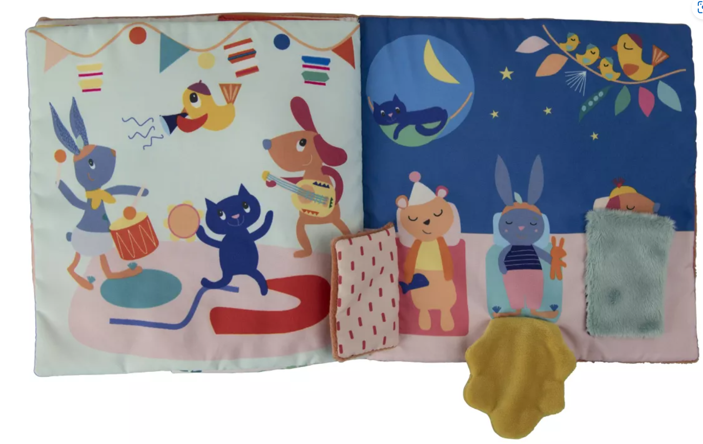 l'histoire du soir, mais aussi outil d'éveil avec les nombreuses activités comme le papier bruissant, les grelots, les pouet pouet ...